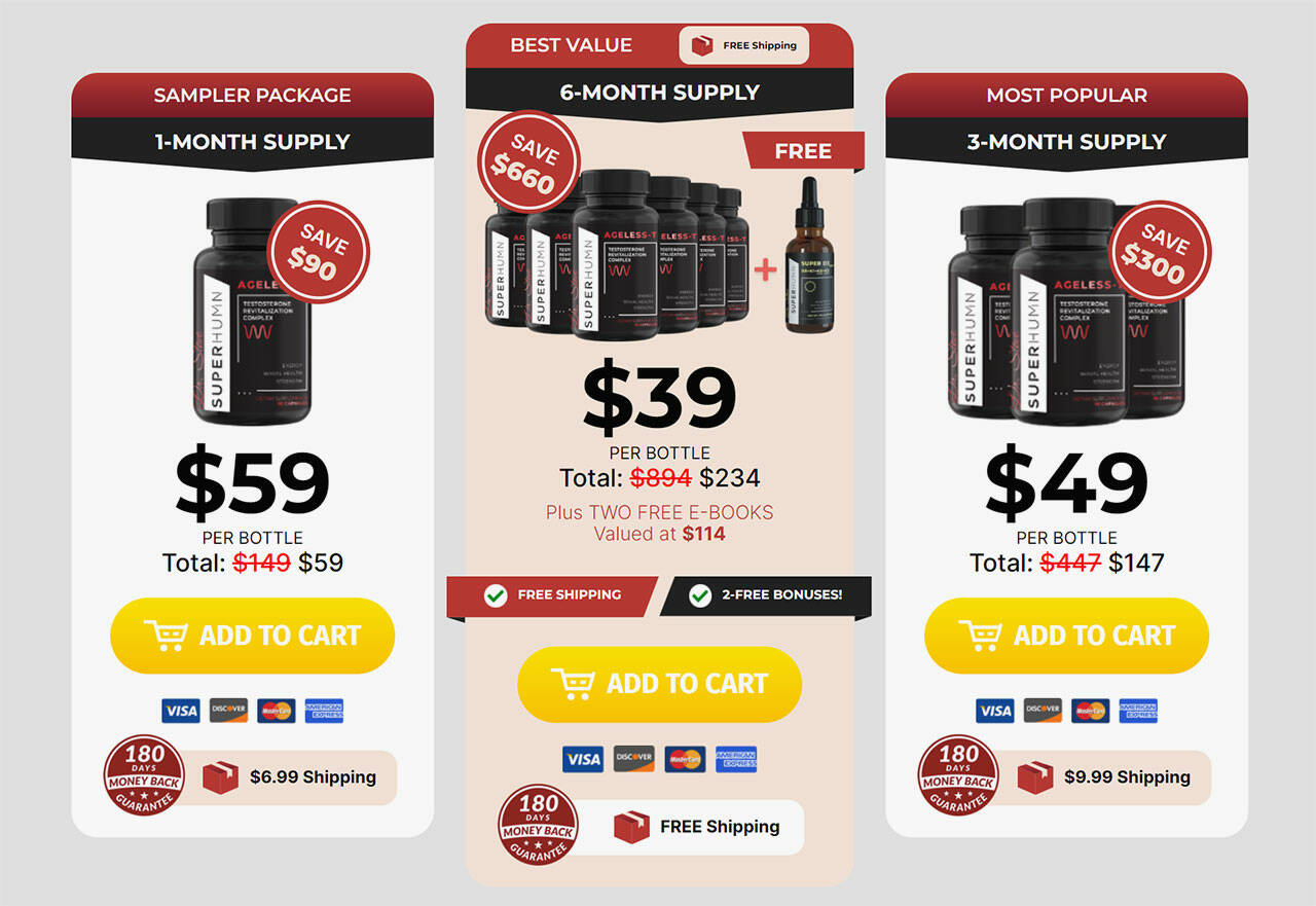 Ageless-T comes in several pricing packages, catering to different user needs and preferences. Here’s a breakdown of the pricing options available for this testosterone support supplement: