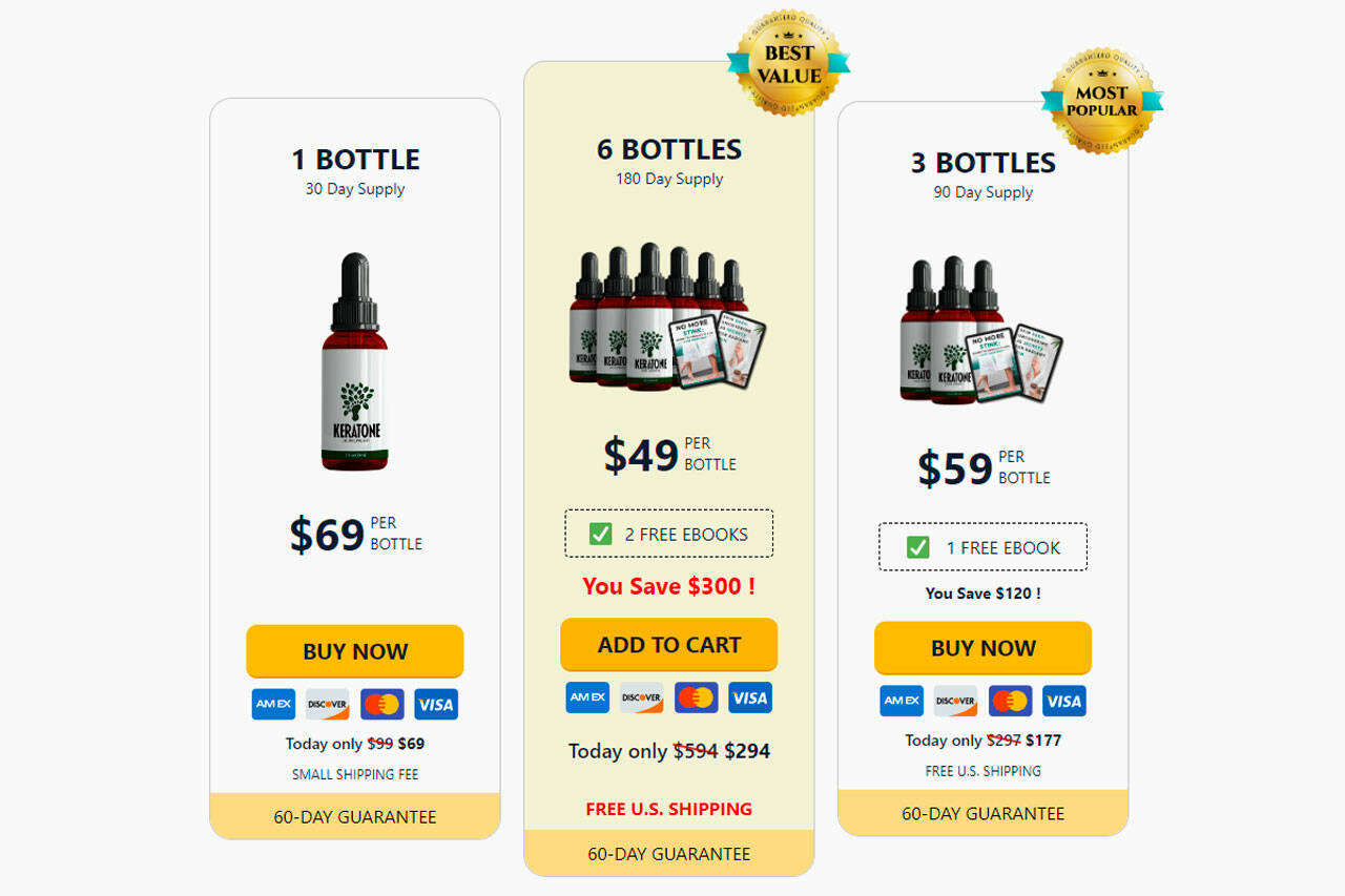 Keratone typically costs $99 per bottle. As part of an online-only 2024 promotion, however, you’ll pay just $69 per bottle or less. Plus, qualifying purchases include free shipping and free bonus eBooks.