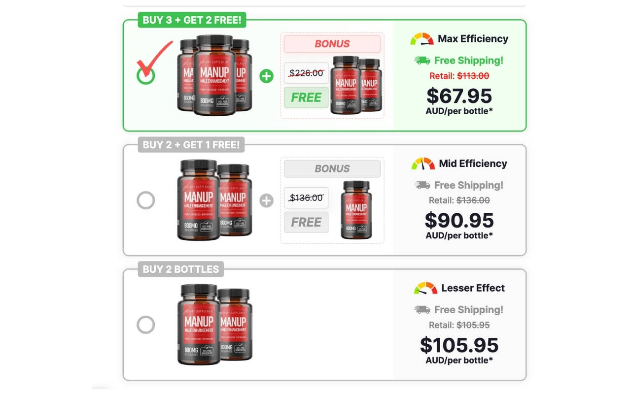 ManUp Male Enhancement Gummies are available exclusively to Australian residents through the official website. The products are offered in various packages to accommodate user needs and preferences. This detailed report provides an overview of the pricing structure, offers, and additional costs of purchasing ManUp Male Enhancement Gummies.