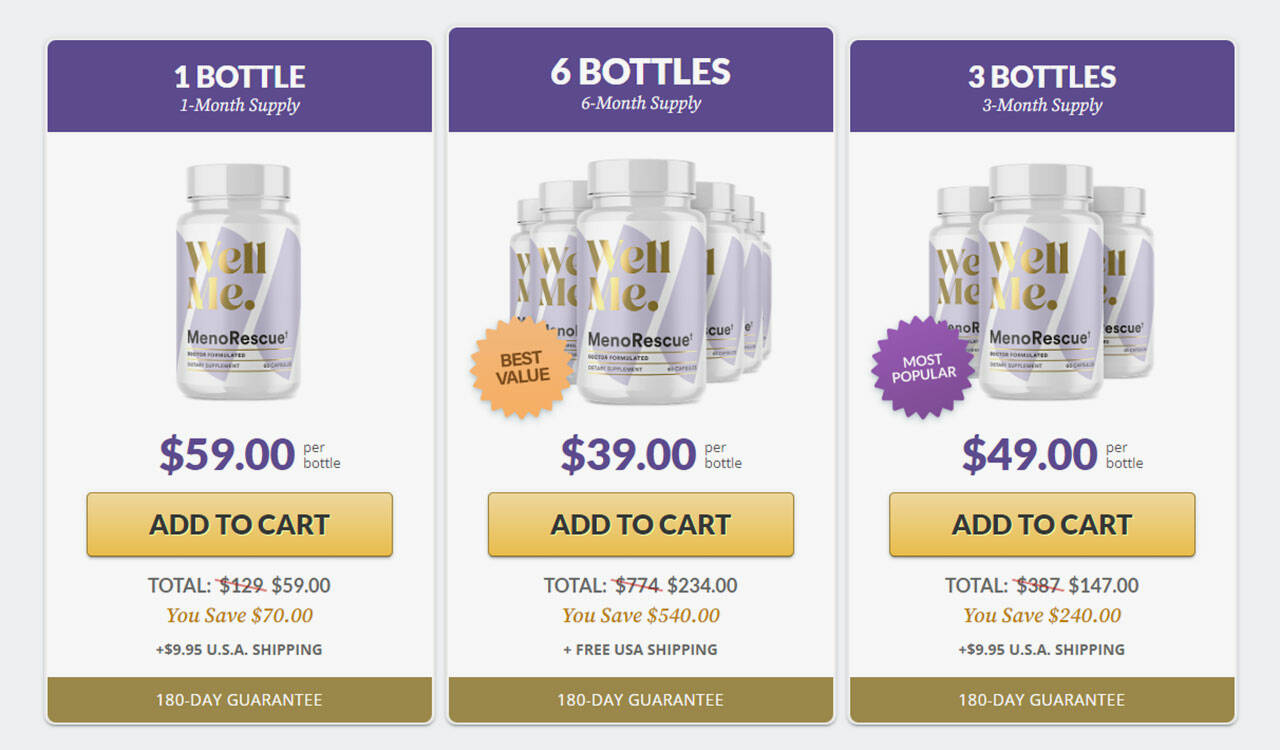 Embarking on a journey towards post-menopausal well-being is now within reach with MenoRescue. The cost of this comprehensive support system begins at $59 per bottle, ensuring accessibility without compromising on quality. To provide you with the utmost confidence in your investment, MenoRescue offers a generous 180-day refund policy. This commitment underscores our belief in the efficacy of our product, allowing you ample time to experience the transformative benefits. Your well-being is our priority.