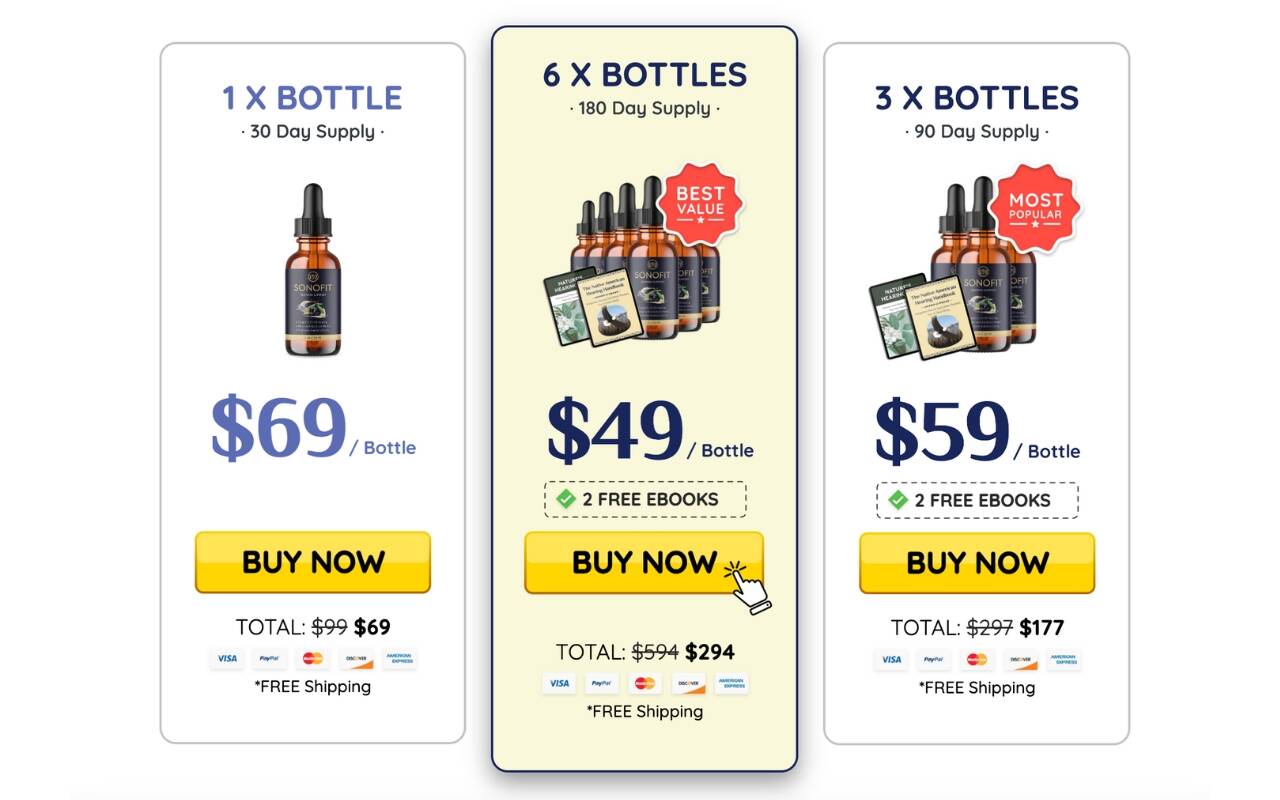 The pricing strategy of SonoFit is particularly appealing for those looking to make a long-term commitment to their hearing health. The 3 and 6-bottle packages provide significant savings compared to purchasing single bottles, and the inclusion of free e-books adds further value.