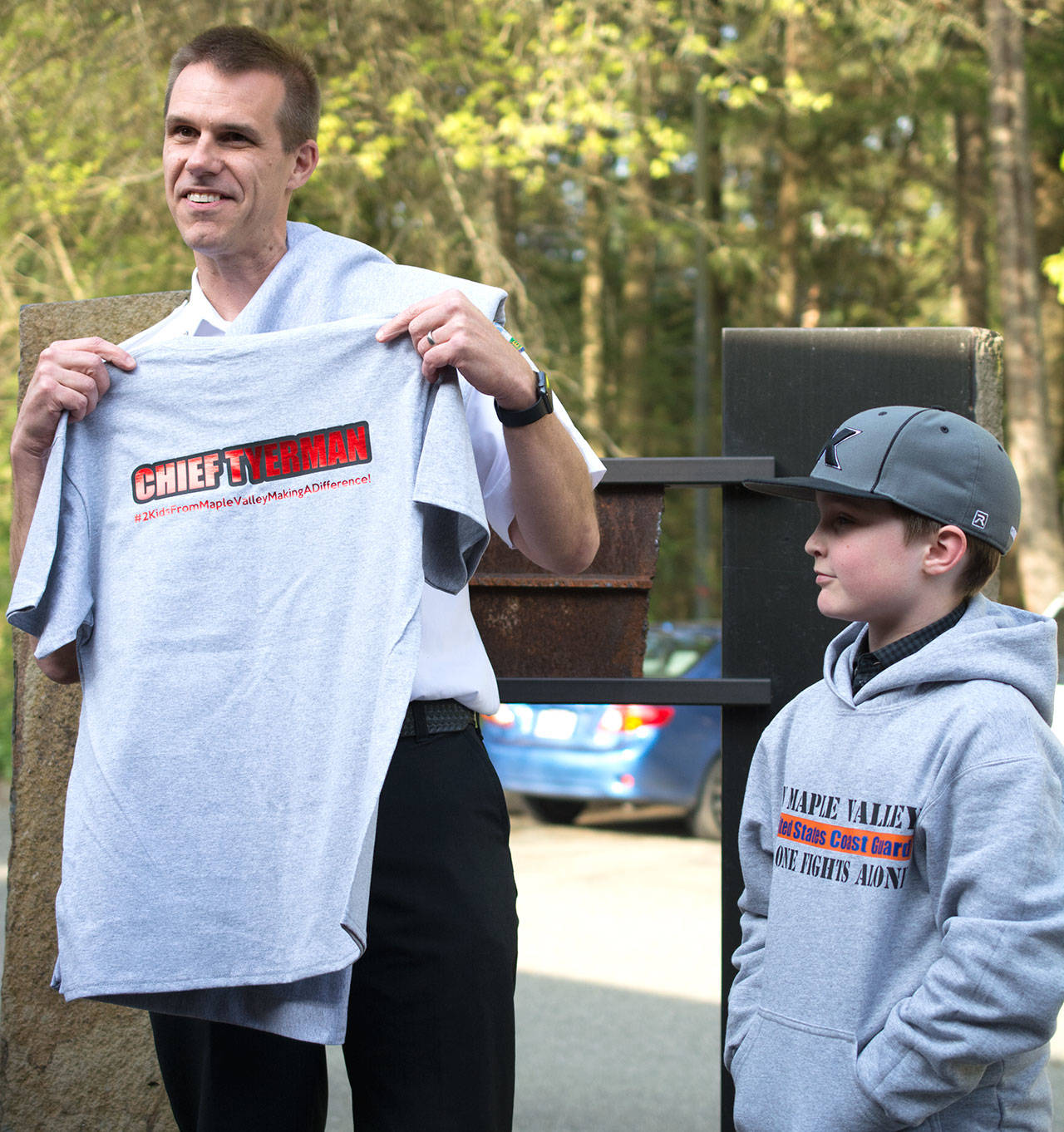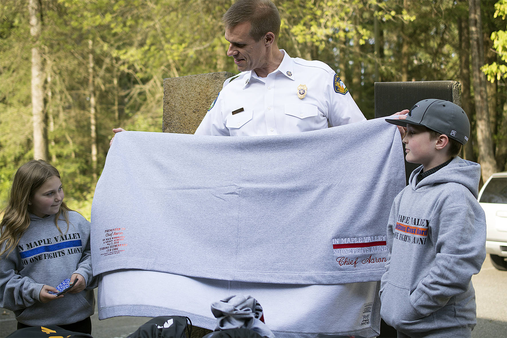 The kids presented their finished blankets to Maple Valley Fire Chief Aaron Tyerman, Maple Valley Police Chief DJ Nesel and a local veteran, Angelo Mupeo at Fire Station 81on May 3. According to McCord’s mom, he wanted to come up with a project that would “hug” these community heroes to show them someone is there for them.