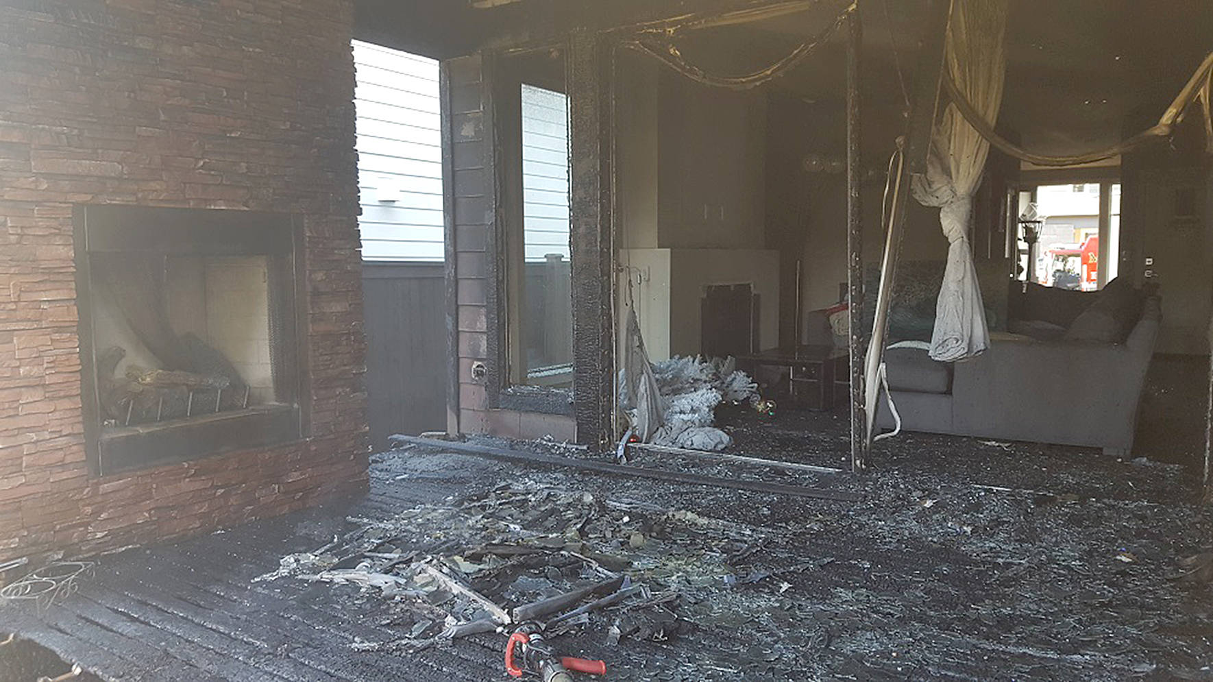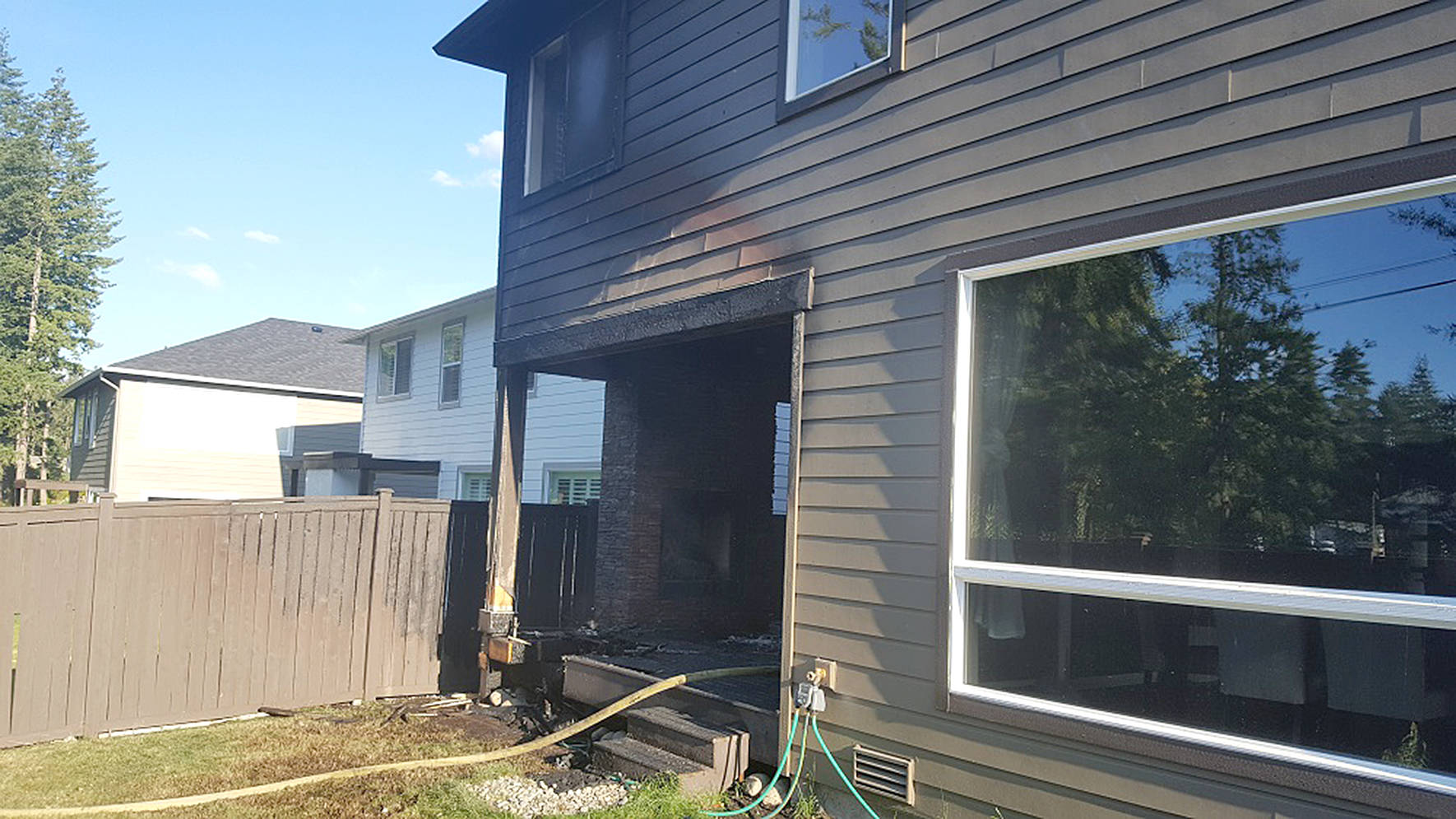 The chief and Puget Sound Fire Engine No. 80 were the first to arrive on the scene. A fire hose was quickly pulled to the back of the house and knocked down the fire on the deck. The back glass door of the home shattered during the heat so a second fire crew entered from the front of the house, keeping the flames from entering the home.