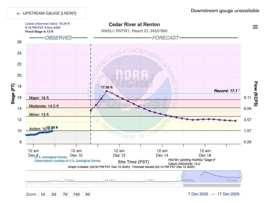 As major flooding continues throughout Western Washington, data shows that areas along the Cedar River and the surrounding low-lying region in the Renton area are forecasted to reach moderate levels of flooding by 10 p.m. Wednesday, Dec. 10, and major flooding levels by 10 a.m. Thursday, Dec. 11, before receding as the day goes on.