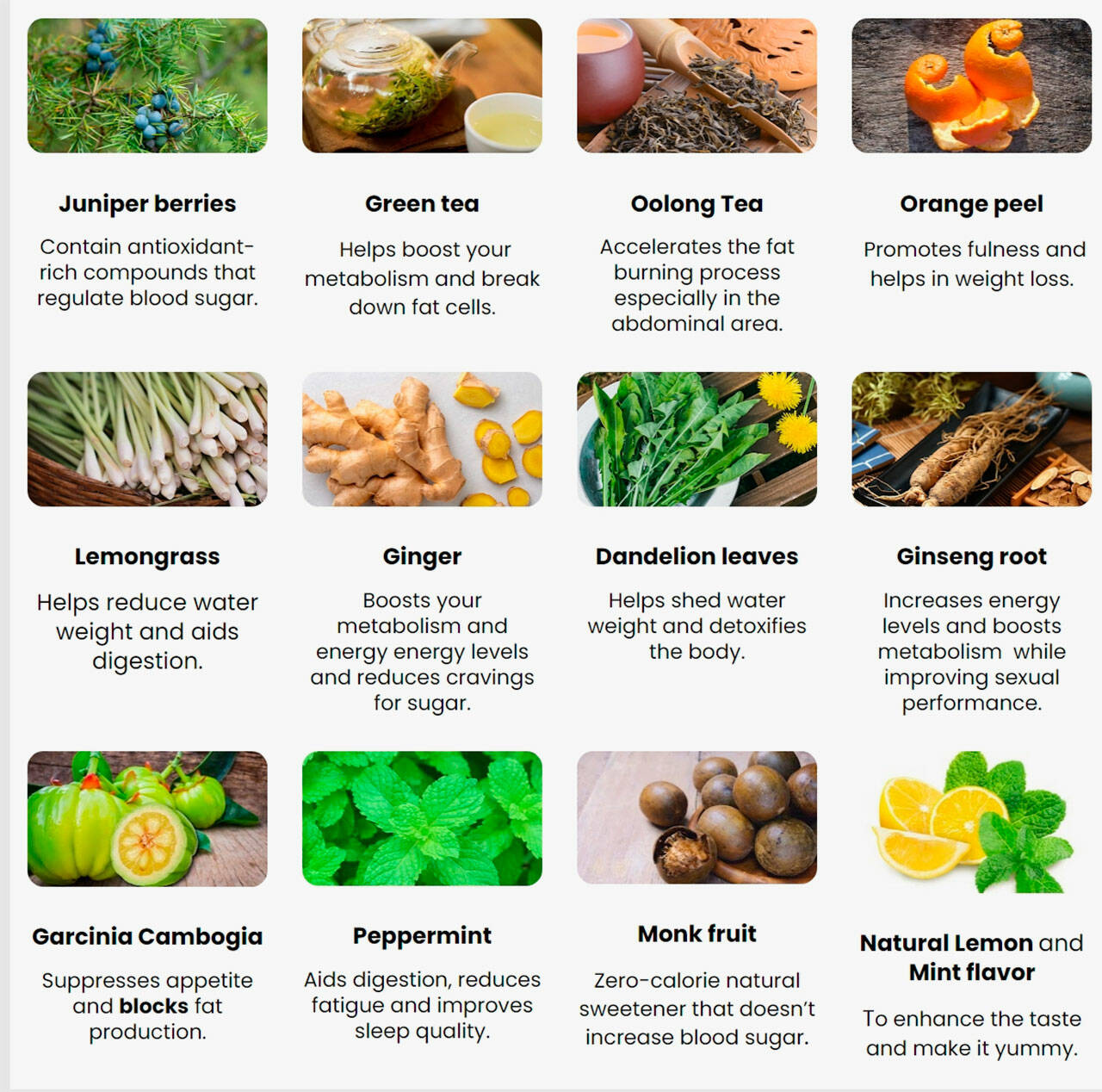 The tea has powerful ingredients that increase your metabolic rate causing the body to burn more carbs and fat for energy. Each tea bag flushes out excess pounds, increases your energy levels, boosts cognitive functions, and supports cardiovascular health.