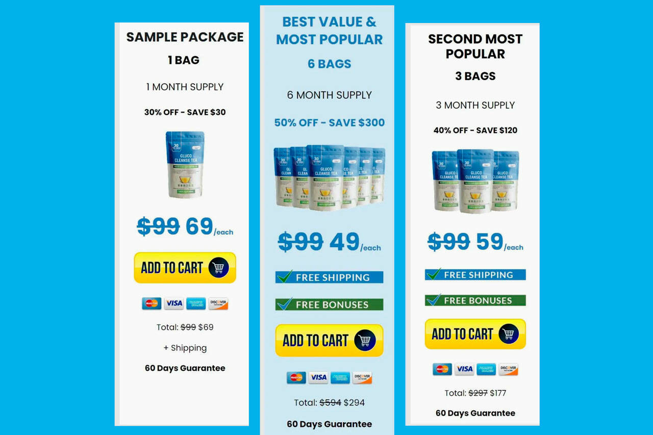 - Six bags of Gluco Cleanse Tea at $49 each + free shipping + two free bonuses.