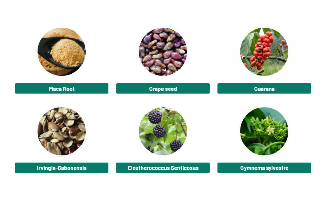 Maca Root, Grape Seed, Guarana, Irvingia-Gabonensis, Chromium Picolinate Eleutherococcus senticosus, and Gymnema Sylvestre
