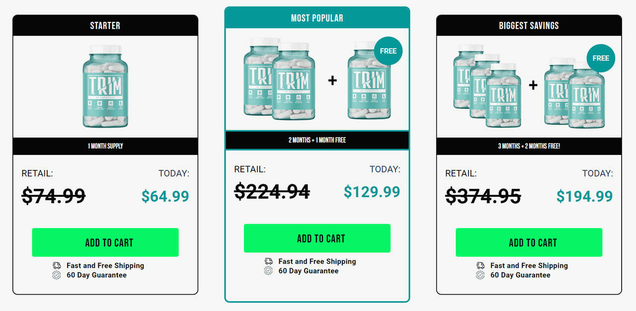 Order a single bottle of Trim to get your feet wet with this potent fat-burning supplement. You pay $64.99 per unit, saving $10 off the regular retail price of $74.99.