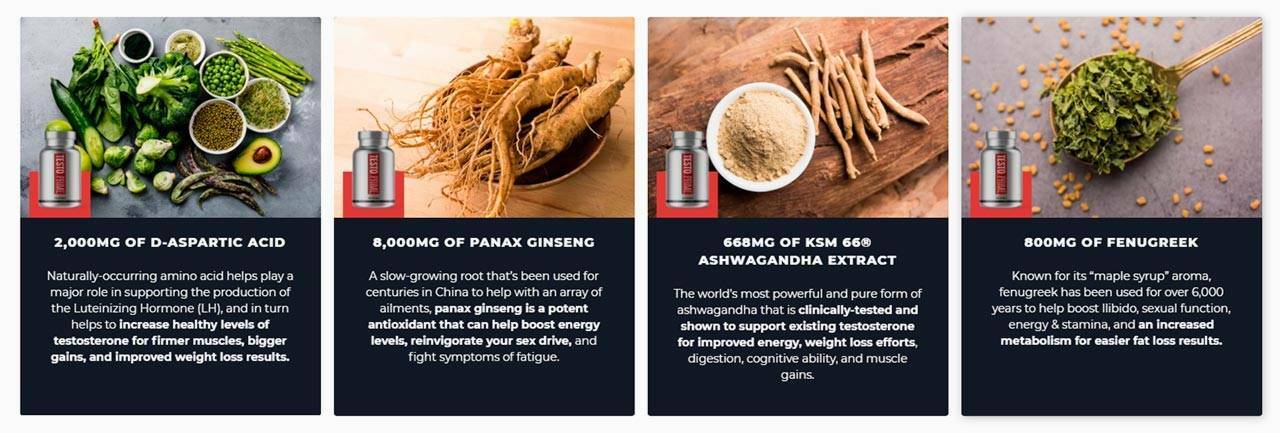 Panax Ginseng, D-Aspartic acid, Fenugreek, Green tea extract, Pomegranate extract, Vitamin B6, Vitamin B5, Garlic, Black Pepper.