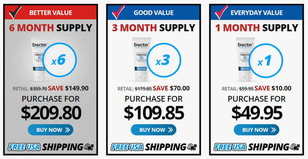 - Order a three-month supply and get three tubes of Erectin for $36.61 each (order total $109.85). You save $70.00 off the regular retail price of $179.85.